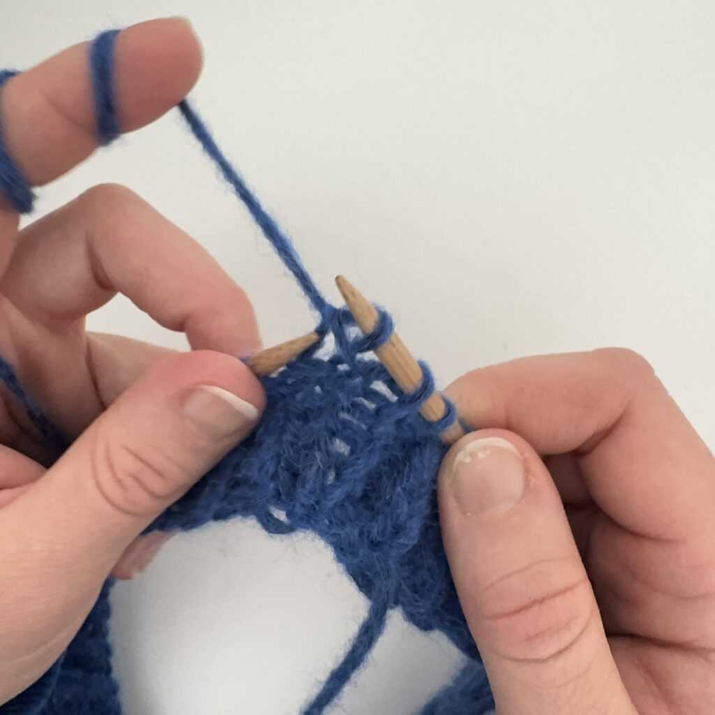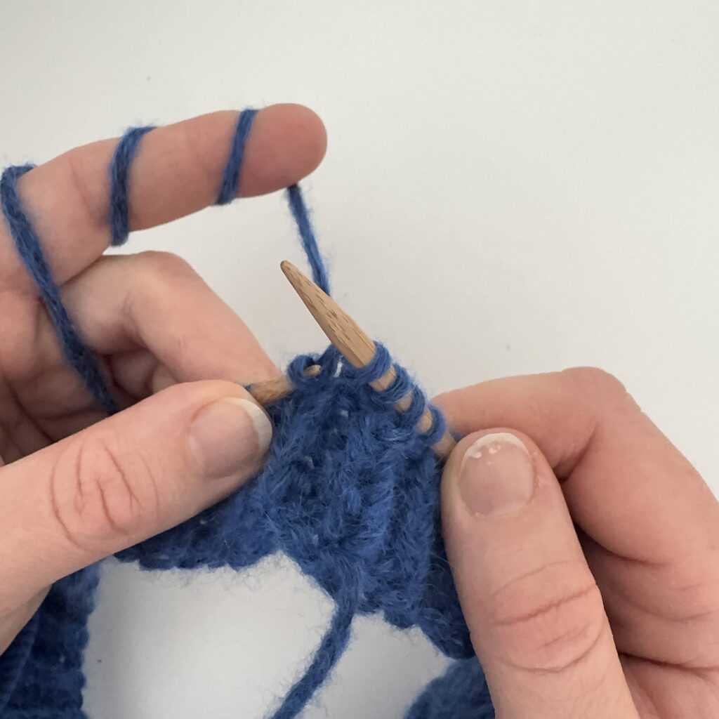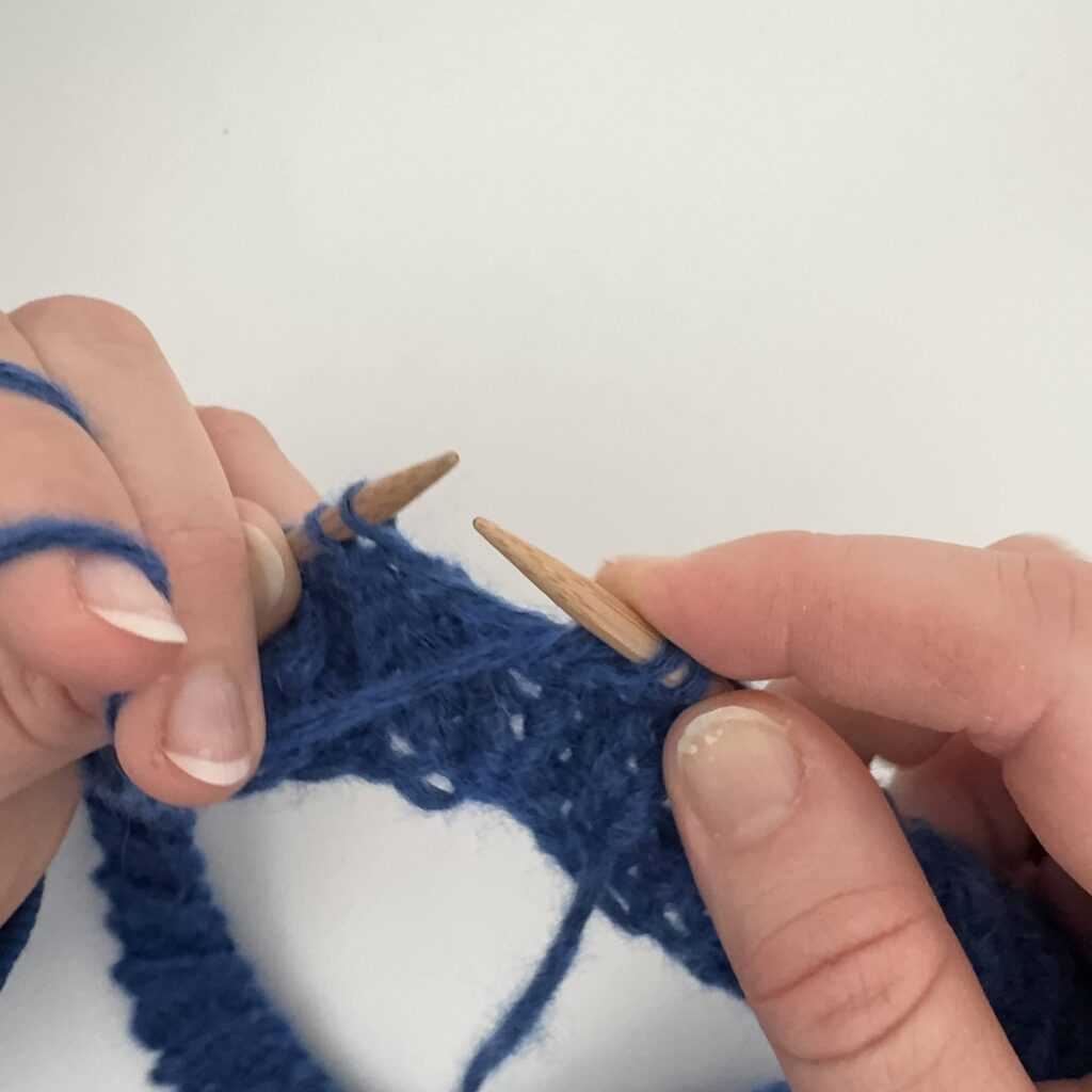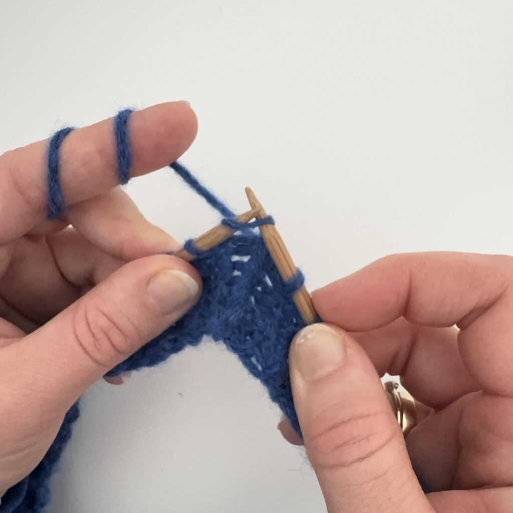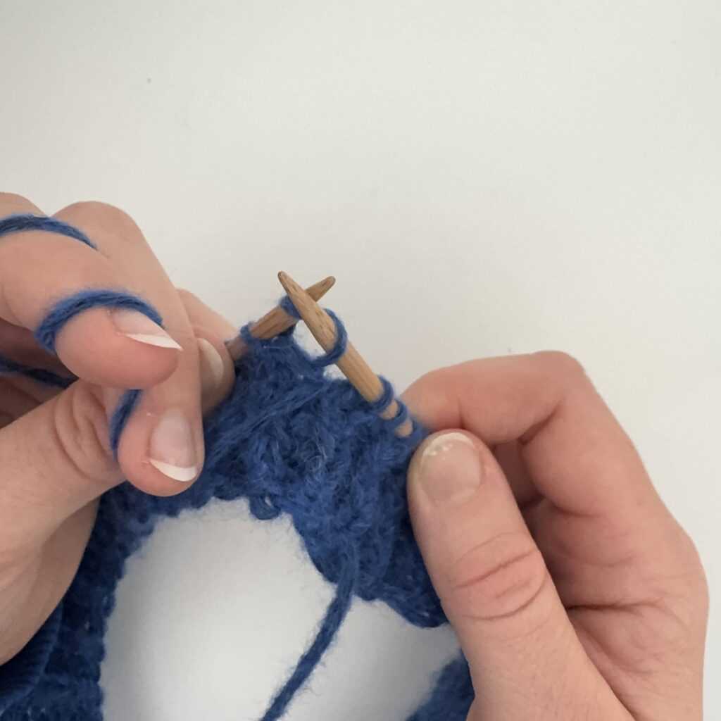 Wbijamy się w oczko od tyłu, kierując drut od strony prawej do lewej.