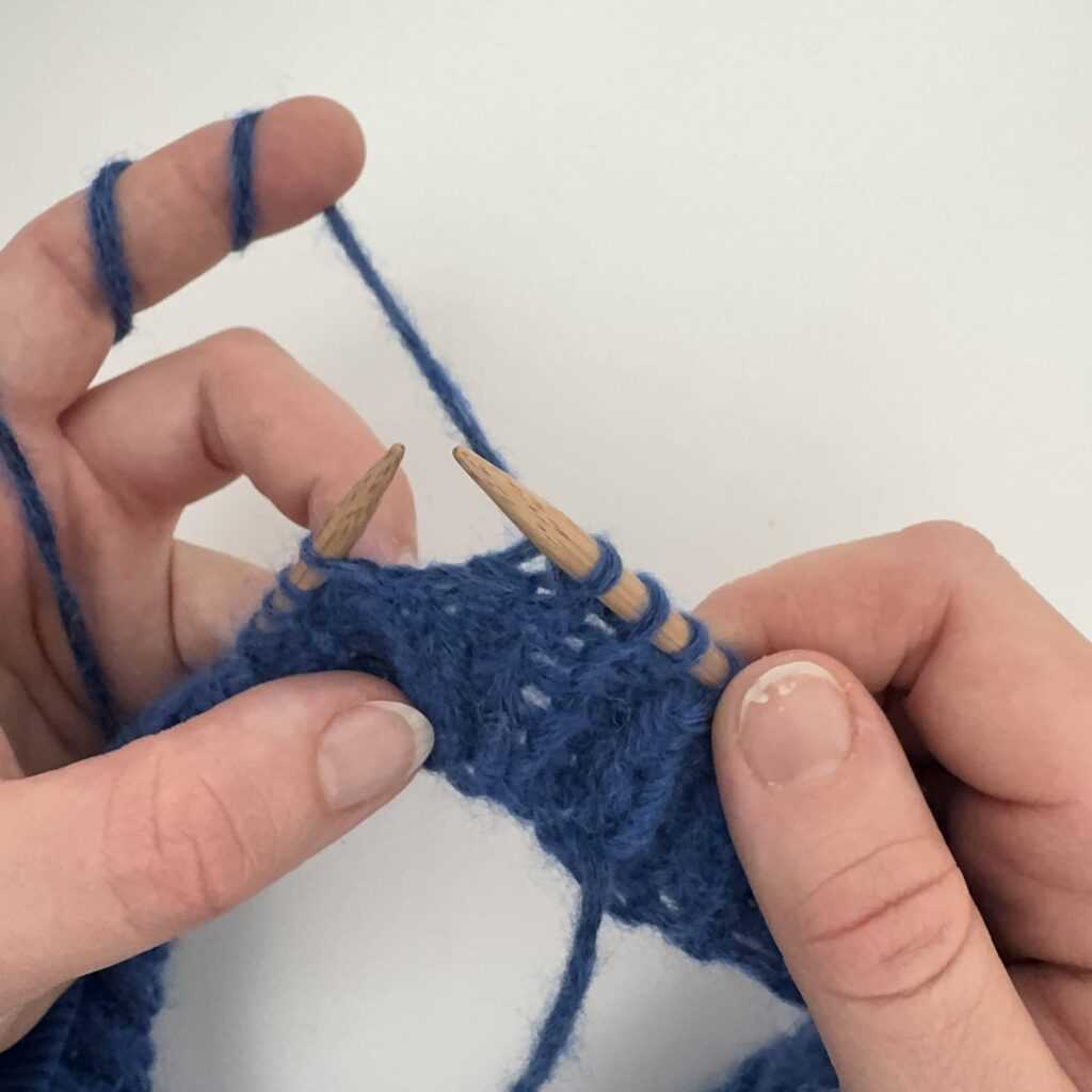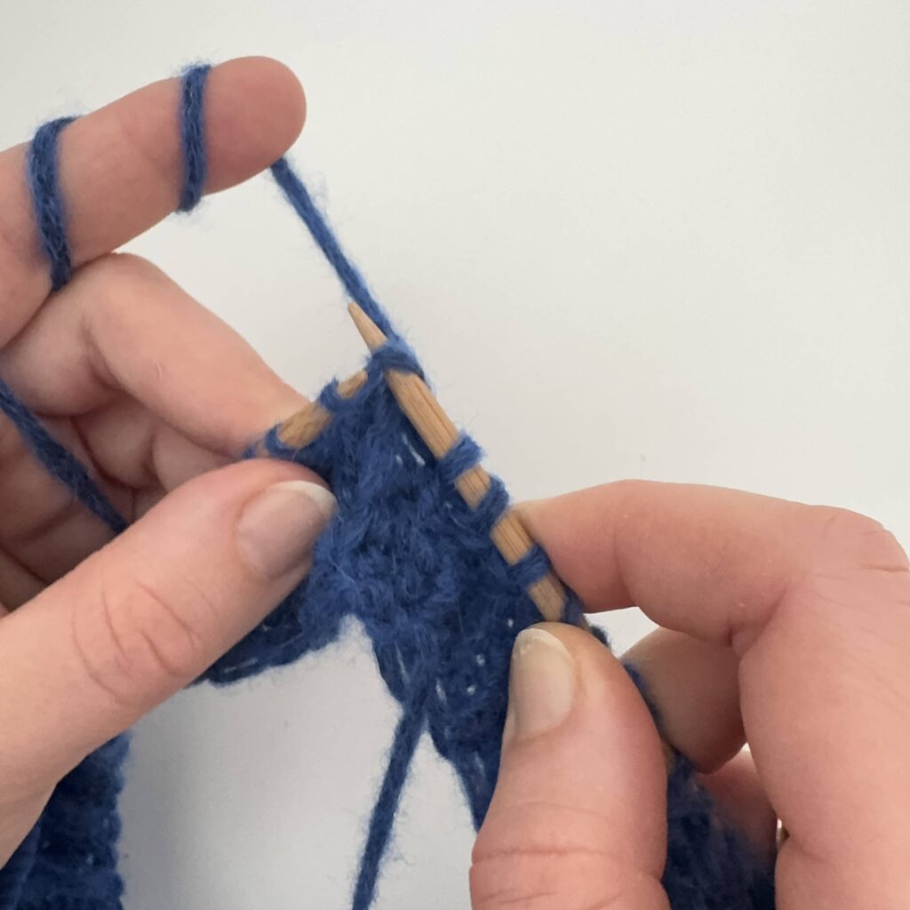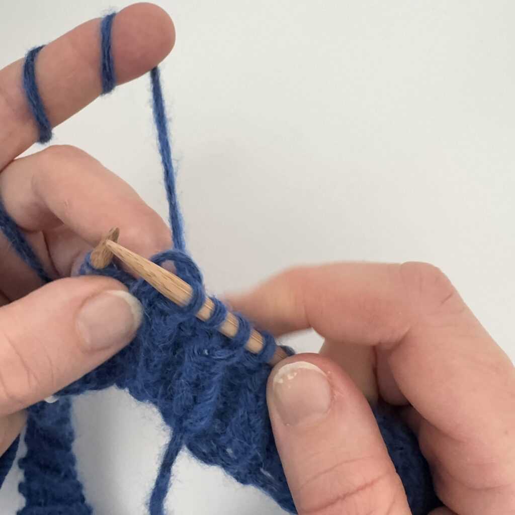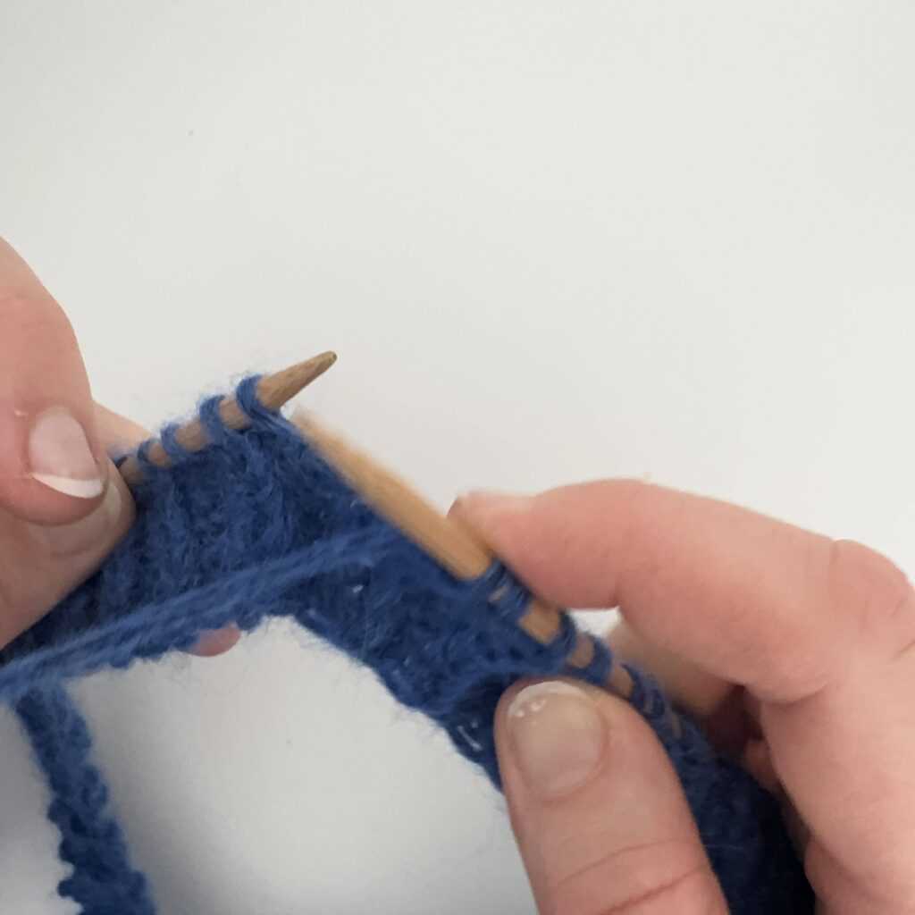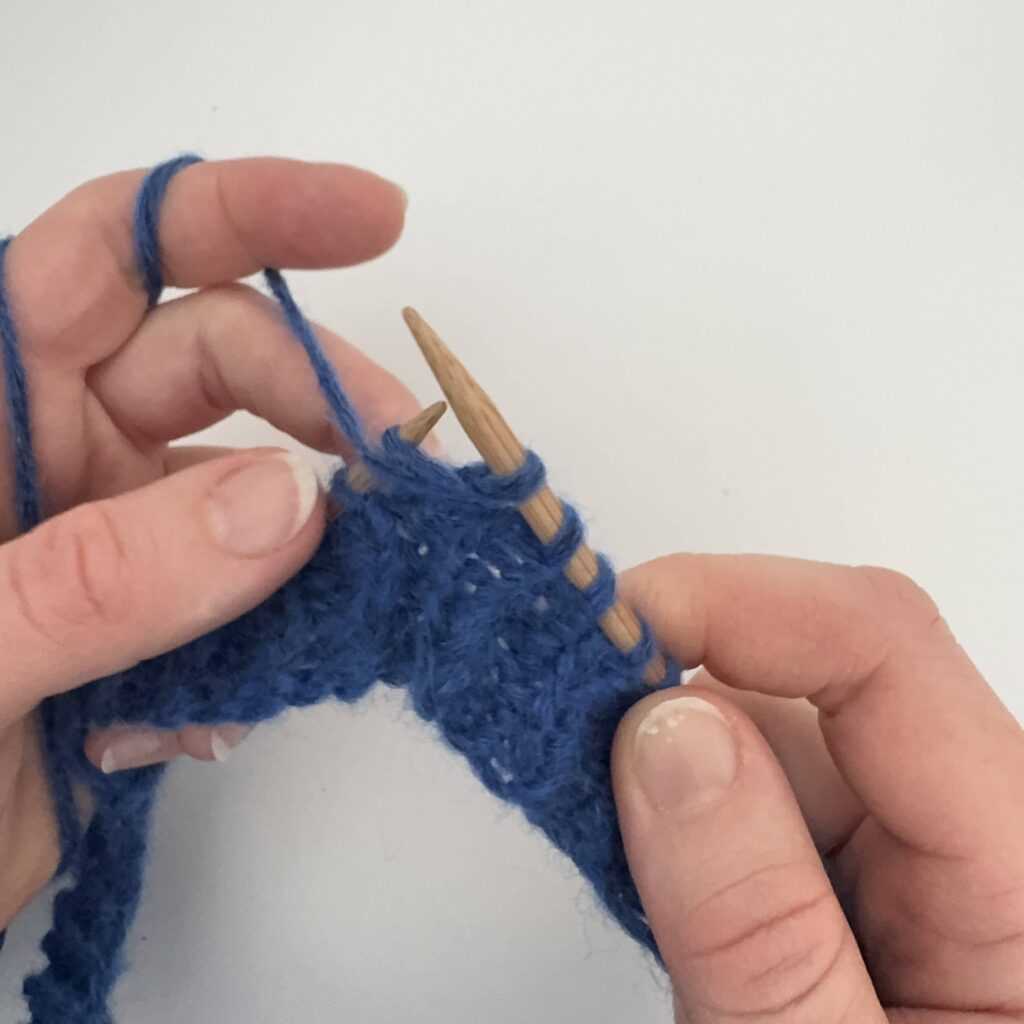 Wbijamy się w oczko od tyłu, kierując drut od strony prawej do lewej.
