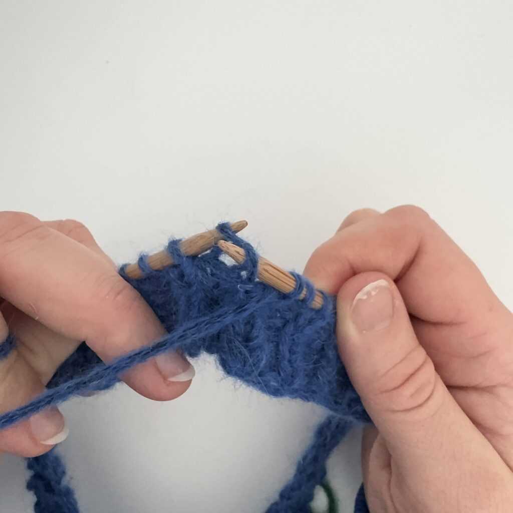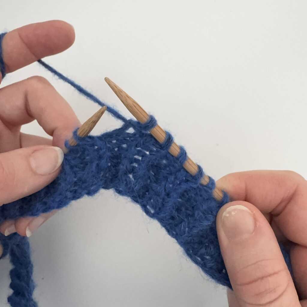 Wbijamy się drutem od tyłu, w oczko lewe leżące rząd niżej.